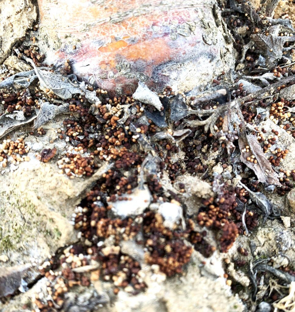Brown, round resting structures (Sclerotia) of the southern blight pathogen at the base of an infected crabapple plant.